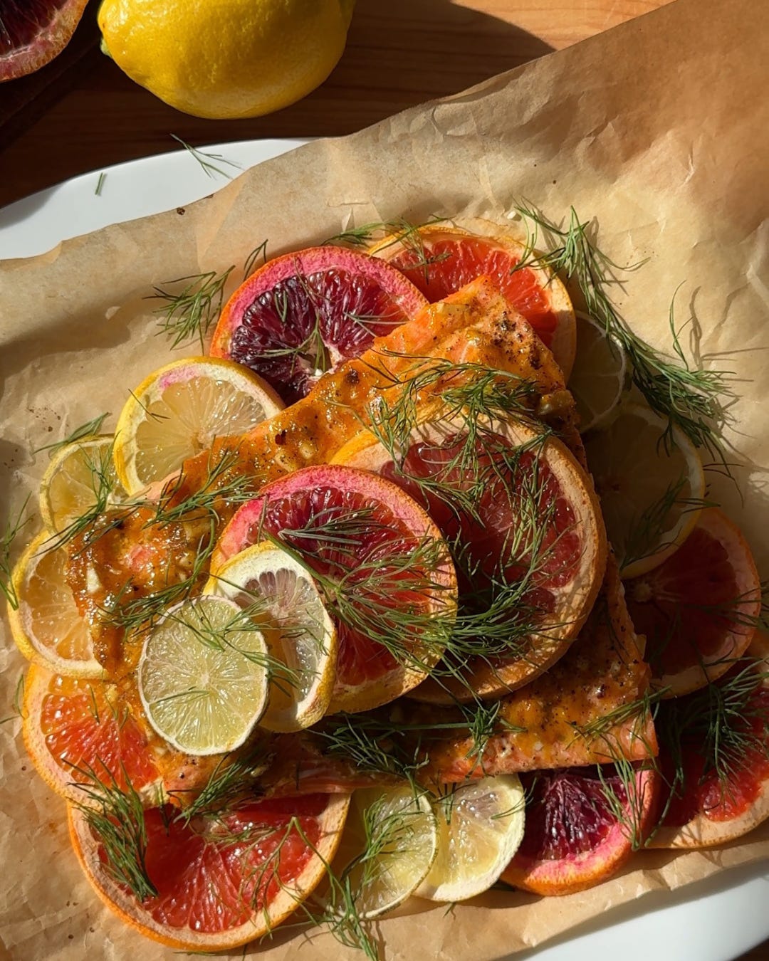 Place the salmon on the prepared baking sheet. Rub the marinade over the salmon and arrange citrus slices underneath and on top.